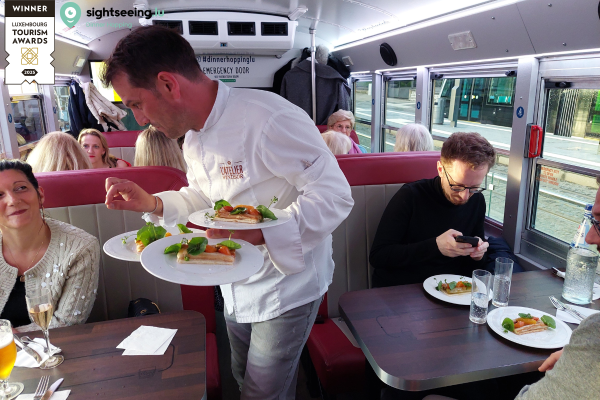 Le concept du “Dinner Hopping” s’articule autour de la notion de transition entre différents restaurants, ce qui permet aux participants de savourer une gamme variée de repas tout en traversant les rues et les vues magnifiques du Luxembourg. Le personnel dévoué du restaurant servira un menu à trois plats à bord du bus. A chaque arrêt, une pause de 20 à 30 minutes se propose où les passagers ont la possibilité sortir ou d’utiliser les installations du restaurant.